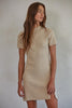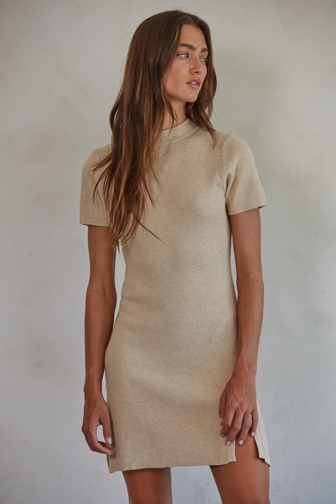 Knit Ribbed Mock Neck Short Sleeve Mini Dress with Front Slit